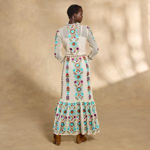 An absolute showstopper. our Ary Embroidered Maxi Dresss is a sleek. figure-flattering column of drama??featuring delicate mesh. brilliant allover floral embroidery and feminine lace at the neck and bracelet-length sleeves. Button front; fully lined. Hand wash. Imported. Sizes XS (0?C2). S (4?C6). M (8?C10). L (12?C14). Approx 56l.