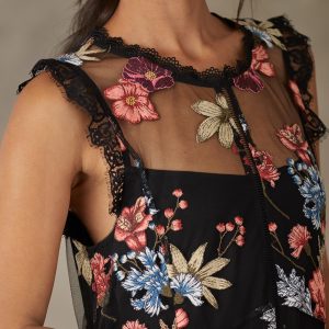 This sophisticated. sleeveless dress features multicolor floral embroidery. delicate scalloped lace at the neck and sleeves. a separate slip and is embellished with ladder lace down the front. Keyhole back. Polyester/cotton. Hand wash. Imported. Black floral. Sizes XS (0-2). S (4-6). M (8-10). L (12-14). XL (16-18). XXL (2022). Approx 52L.