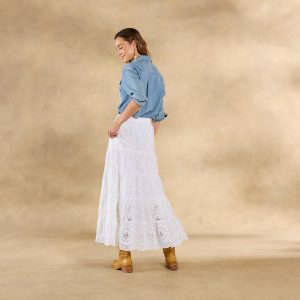 Our easygoing Ensenada Skirt features breezy tiered eyelet in a versatile midi length with a forgiving elastic waistband and a charming scalloped hem. Cotton. Machine wash. Imported. Exclusive. Sizes XXS (00). XS (0?C2). S (4?C6). M (8?C10). L (12?C14). XL (16?C18). Approx. 33l.