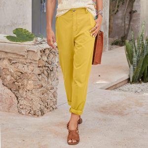 Easy and stylish. our tapered leg pants boast an easy fit with flat front and elastic back. Two slash pockets. two back welt pockets. Cotton. Machine wash. Imported. Exclusive. Sizes 2-16. 29 inseam.