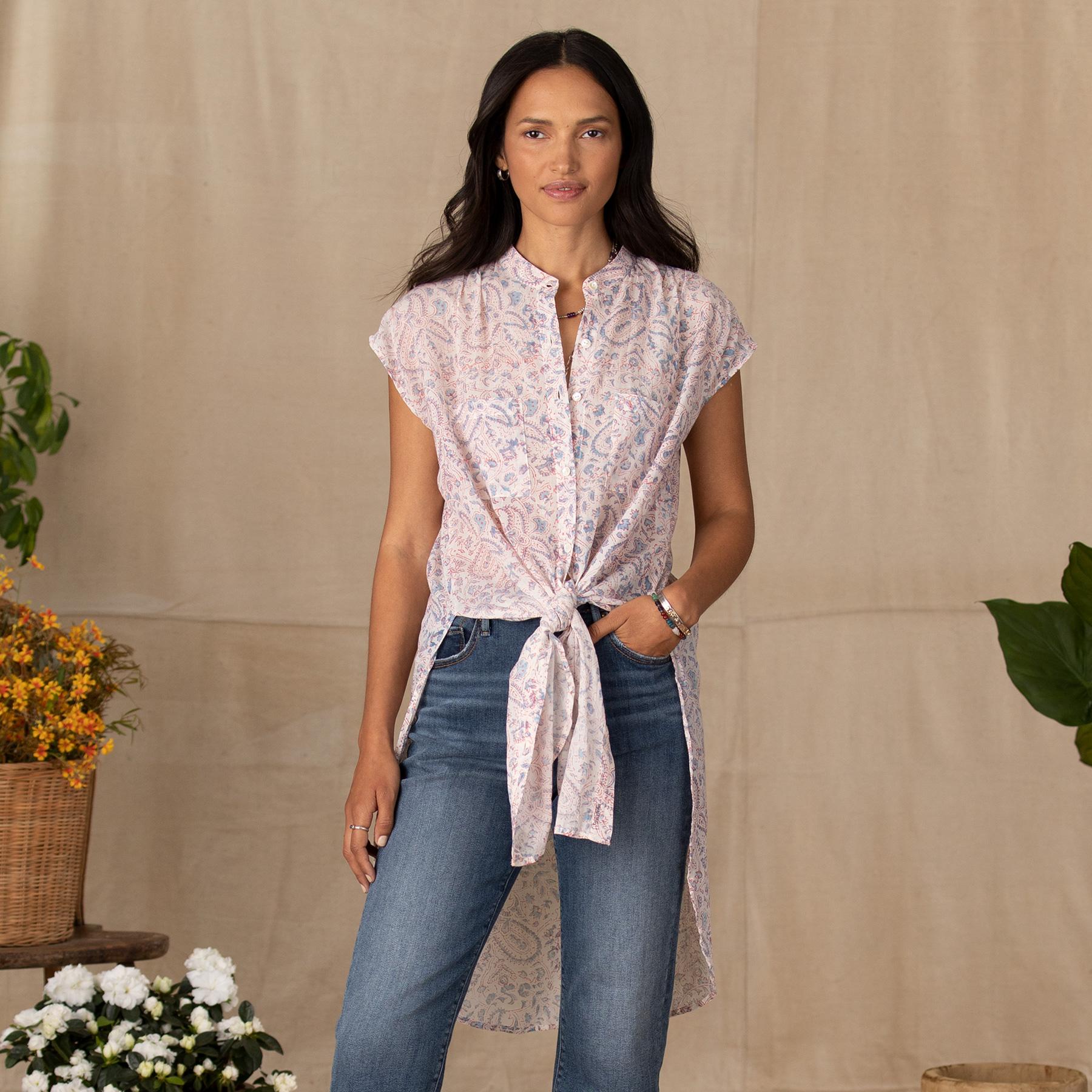 This button-down. sheer tunic is made of fine. handprinted cotton in a paisley print and makes a beautiful cover-up. Hi-lo hem. Cotton. Machine wash. Imported. Exclusive. Sizes XS (0 to 2). S (4 to 6). M (8 to 10). L (12 to 14). XL (16 to 18). XXL (20 to 22). Approx. 36L front. 42L back.