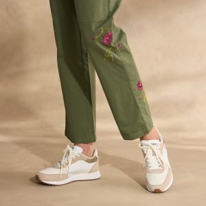 Overflowing with beautiful detail. our asymmetrical floral embroidered cargo pants feature a flattering Hollywood waist with two buttons. five pockets and a straight leg fit. Cotton/lycra. Machine wash. Imported. Exclusive. Sizes 2?C16. 26.5 inseam.