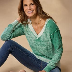 Reverse printed for a casual. faded look. our relaxed-fit sweater boasts an alluring V-neck front and back. exposed seaming details. rib trim and side slits. Subtle hi-lo hem. Cotton. Hand wash. expect dye transfer or loss. Imported. Exclusive. Sizes XS (0–2). S (4–6). M (8–10). L (12–14). XL (16–18). XXL (20–22). Front approx. 23l.