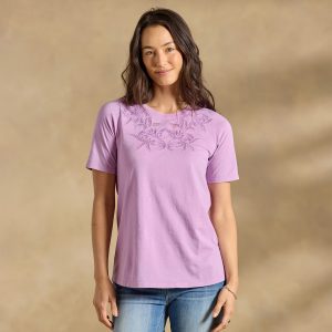 Nature-inspired tonal lace applique brings a feminine charm to our essential Toluca Tee. So comfortable and flattering you’ll need one in every color! Cotton. Machine wash. Imported. Exclusive. Sizes XS (0–2). S (4–6). M (8–10). L (12–14). XL (16–18). XXL (20–22). Approx. 24l.